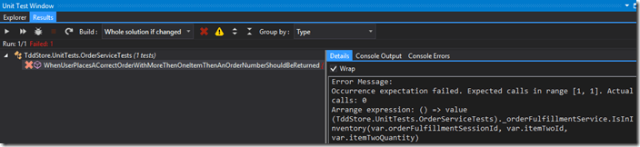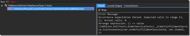 31: Assert.AreEqual(expectedOrderId, result); 32: Mock.Assert(_orderDataService); 33: Mock.Assert(_orderFulfillmentService); 34: } I’ve added a couple things here. First I’ve added the OccursOnce condition to the arrangement for the mock of IsInInventory on line 19. I also added a missing call to the CloseSession method of the order fulfillment service. Finally I assert the order fulfillment mock on line 33. Running the test results in failure (figure four):