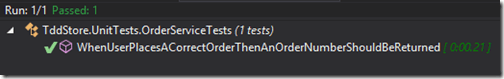 There is no rule that says only QA testers will find defects. Everyone who works with the application from BA’s to developers to end users can find problems with an application. You should constantly be on the lookout for possible issues with your application. For example; the team developing our TDD Store application participates in a code review. As unit tests are part of our applications code they are reviewed as well. The team finds a problem with the WhenUserPlacesACorrectOrderThenAnOrderNumberShouldBeReturned test. Here’s what this code looks like now:
