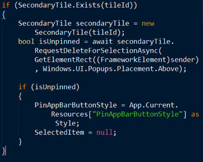 Next, inside the PinToStartScreen method, I check if the secondary tile is already pinned. If so then I request a deletion and then update the app bar icon. I pass the sender element to the dialog that is shown before pinning / unpinning a tile. This is the app bar button that is used to position the dialog.