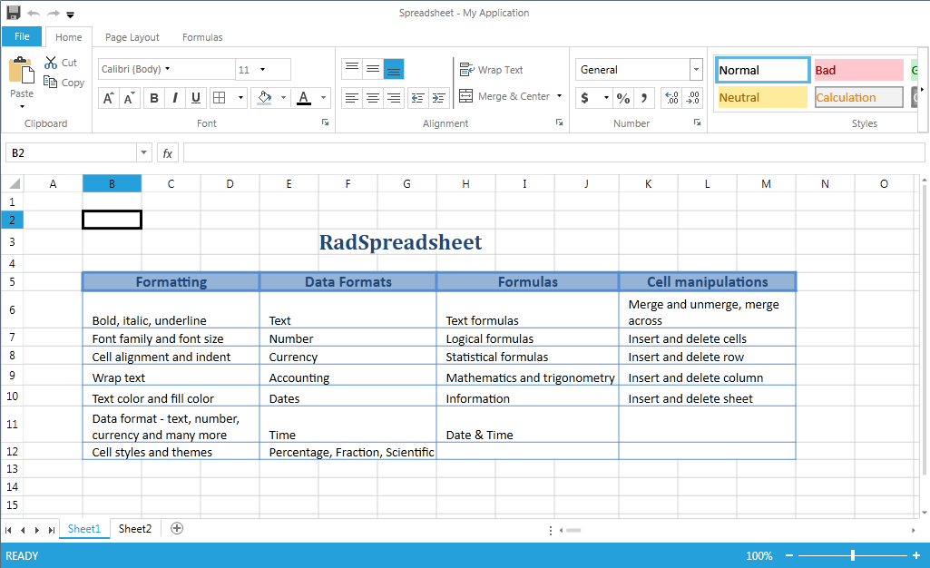RadSpreadsheet is a control that allows editing tabular data utilizing a variety of cell formatting options, styles and themes. It can contain one or more Worksheets, each of which with its own Scale Factor and Undo/Redo stack. Handy, huh?