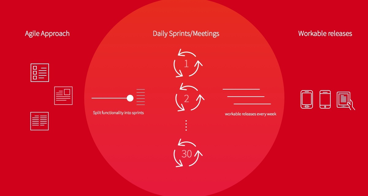 Due to the tight deadline and the requirement to release the first app only after four weeks, we used an agile approach; we split functionality into sprints, held daily meetings and aimed to have workable releases every week. The initial sprints were challenging as sprints were short followed by one to two days of integration testing. The agile approach we used enabled us to build, test and publish the app within only four weeks on both iOS and Android.