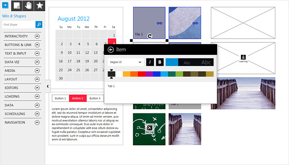 - Tons of built-in galleries with a variety of predesigned shapes and complex controls like Charts, Grids, Tabs, Buttons and any other Windows RT control that comes to your mind.