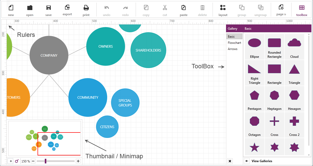 - Groups – Grouping shapes and connections in logical containers. Support for deep hierarchical groups.