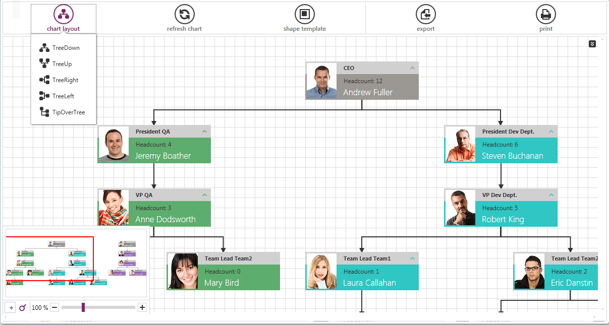 Organizational chart with all the tree Layouts, nicer Connection Routing and different templates...