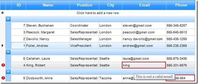 public class Employee : IDataErrorInfo{ //... [Browsable(false)] public string Error { get { if (!IsEmailValid() || !IsNameValid() || !IsPhoneValid()) { return "Please enter valid data in this row!"; } return string.Empty; } } public string this[string columnName] { get { if (columnName == "Email" && !IsEmailValid()) { return "This is not a valid email!"; } //... return string.Empty; } } // ...}