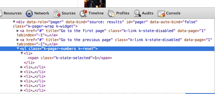 If I right-click the pager buttons, I can see that they are just an unordered list of items. That unordered list has a class of k-pager-numbers.