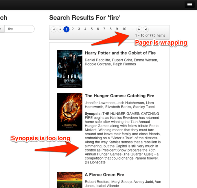 Now when we resize the window, the page numbers and synopsis go away when we are at smaller resolutions. Now the application fits perfectly to the window at any size.