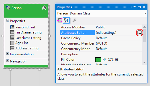 We have added the DataContract and DataMember attributes. But, there is inheritance defined between our classes, so we need to add two KnownType attributes to the base class Person – one for Student and one for Teacher. This is where the Attributes Editor comes into action as it is perfect for managing the attributes of a single persistent class or member.