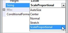 It is important to remember that the Size property refers to the size of the report item, not the actual image that will be displayed. In order to change the size of the image, you must use the Sizing property. Since images come in all different sizes, and it is not always possible to know an image’s dimensions beforehand, there are several Sizing options from which to choose.