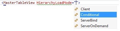 The first of the new features that we added for this release is an option to specify a new Conditional load more for the hierarchy in RadGrid. Currently the grid has three load modes: Server, ServerOnDemand and Client. With Server load mode all child table views are initially databound when the parent table view databinds respectively. ServerOnDemand load mode only binds the child table views when they are expanded on the server and the Client load mode initially binds all table views but subsequent expand / collapse operation happen only on the client. The new Conditional load mode is combination of ServerOnDemand and Client load modes behavior. It works in the following way: when you initially try to expand and item that has never been expanded before, the grid performs a postback and databinds the respective child table view. Subsequent expand / collapse operations happen only exclusively on the client-side without the need to postback again to the server. This improves performance and provides better scalability for large number of records. This state is of course preserved in the ViewState of the control so any operation that recreates the structure of the grid on postback will reset this behavior to its initial state and a postback will be required again when initially expanding an item.