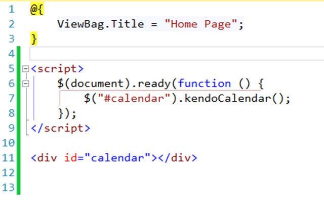 For developers who are comfortable with JavaScript and jQuery, adding Kendo controls to an MVC view is simple. In the example below I’m using the Kendo calendar control. To do this I create a div where I want the control to appear. Then I use the jQuery document ready function to bind my div to the Kendo calendar control: