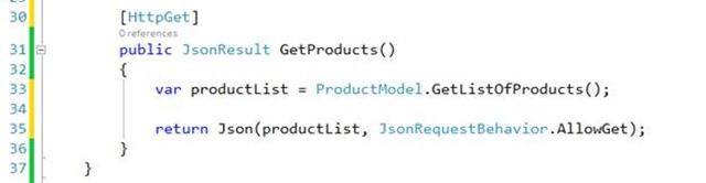 If I’m using ASP.NET MVC it’s easy to create an action on my controller that returns a list of products formatted as JSON:
