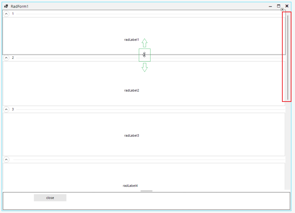 - Once the space gets ocupaied but you still have panels to add, you can minimize the height of the first added panels (1,2,3) by using the up/down arrow marked in green below. When you reduce the height of existing panels, more space will be available on the form for adding new panels or components.
