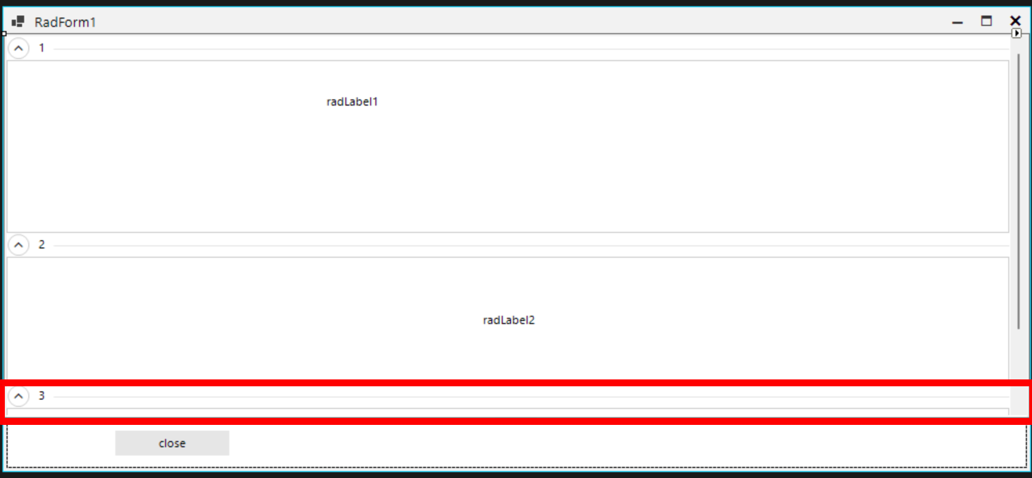 - Start adding RadCollapsiblePanels as you started. Let's say you add 1,2,3 panels.