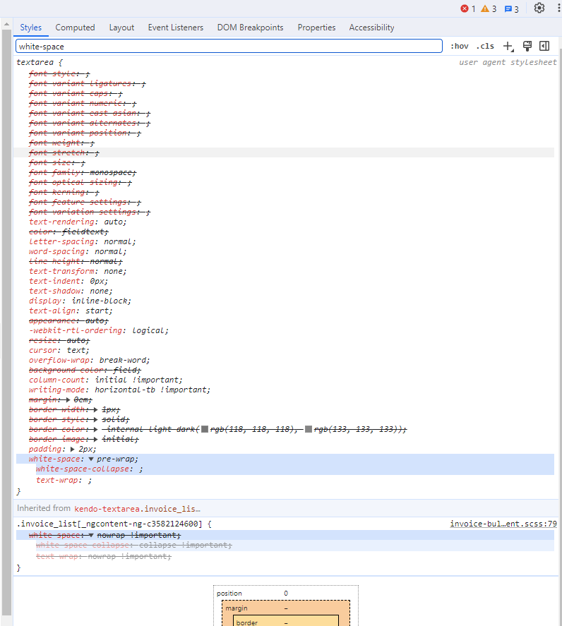 I am having an issue applying a white-space: nowrap style to a kendo-textarea. The parent kendo-textarea has the nowrap style, the textarea inside the kendo-textarea inherites the nowrap but the user agent stylesheet then overrides the nowrap and giving it a pre-wrap.
