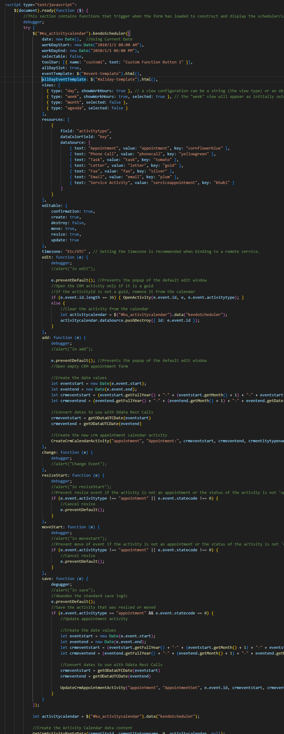 I'm not sure where to put hooks in change that!  There is an edit handler coded in (as part of the scheduler configuration) but it is never triggered.  Here is the configuration for the Kendo Scheduler: