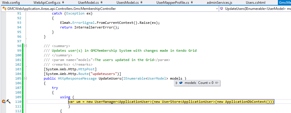 I am using the Kendo grid with Angular and Asp.Net MVC WebApi. I have the grid set up with batch editing and have tried to follow the examples, but I am not getting the data to be updated in my method in the WebApi Controller. I see the data on the update request but when I hit the break point in the method, the parameter has a count of 0. I have tried different scenarios, but have had no luck. Any help is very much appreciated. I have attached screen shots of the parameter at break point and the data on the request in the developer tool in Chrome. Here is my Angular code for the the grid: