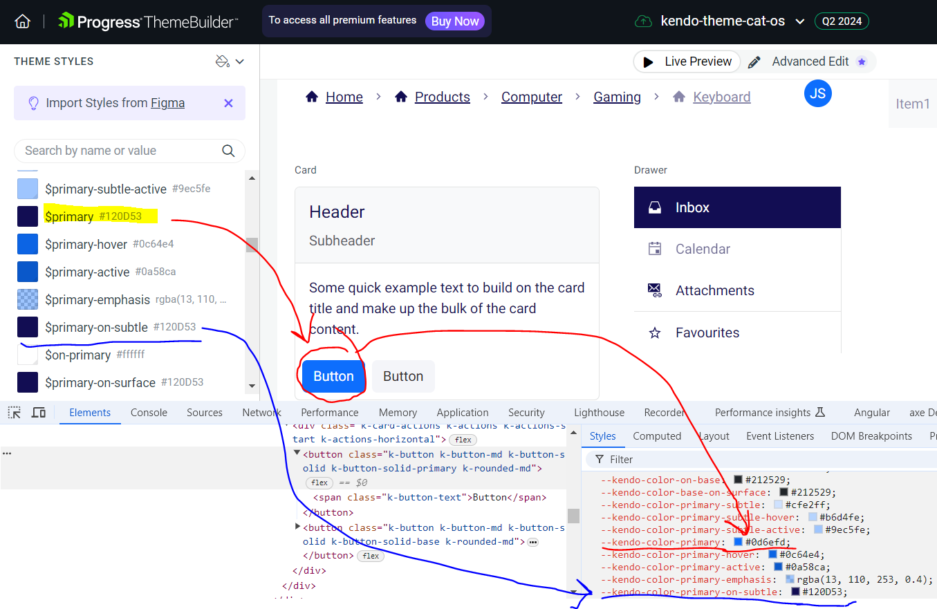 When creating a new project with the latest the version on ThemeBuilder, changing the $primary color value does not update ThemeBuilder or the compiled CSS variable (--kendo-color-primary) when exporting. Changing any other color value works as expected, see the screenshot below: