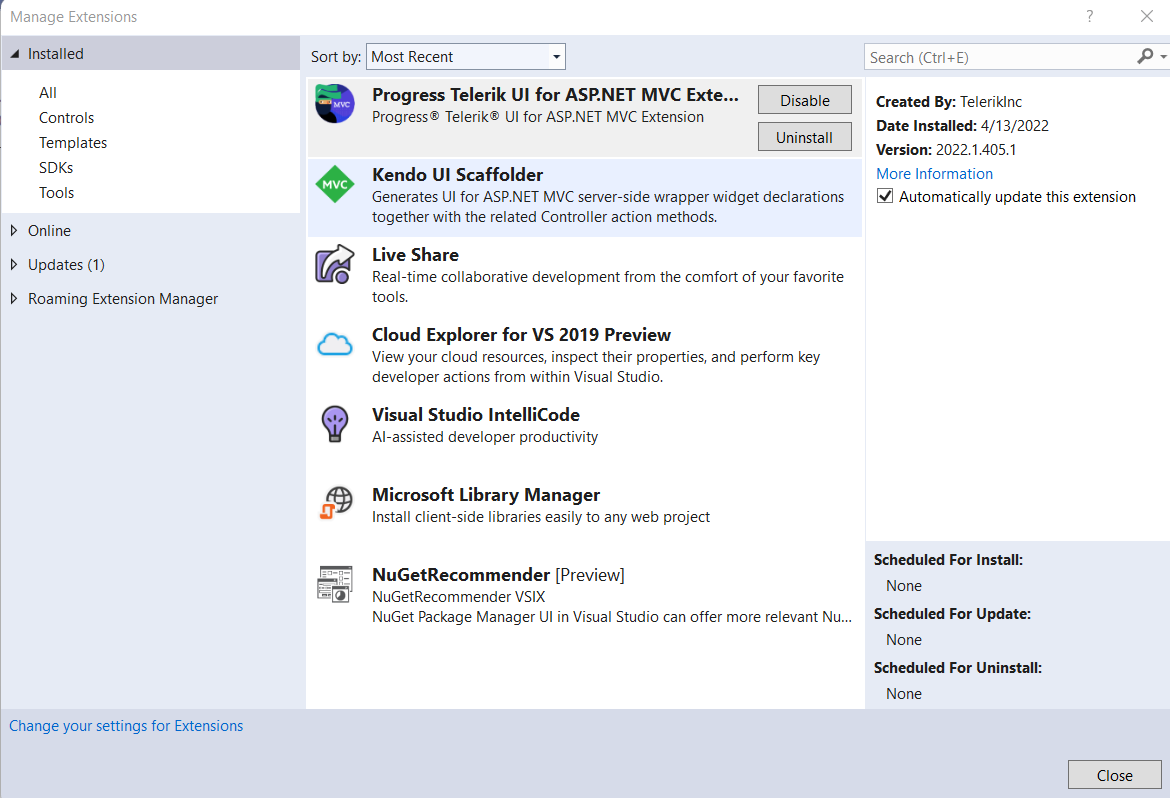 I am unable to find ASP.NET Core scaffolding in VS2022. Then I install into VS2019 and result is same. Unable to view Telerik scaffolding. If any one have the idea how to fix it please help me.
