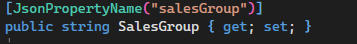 In this example below the column bind the property name "SalesGroup", but the bound method automatically resolves the name "salesGroup" (the name of JsonPropertyName attribute). Since the first letter is lowercase, the column does not display the value