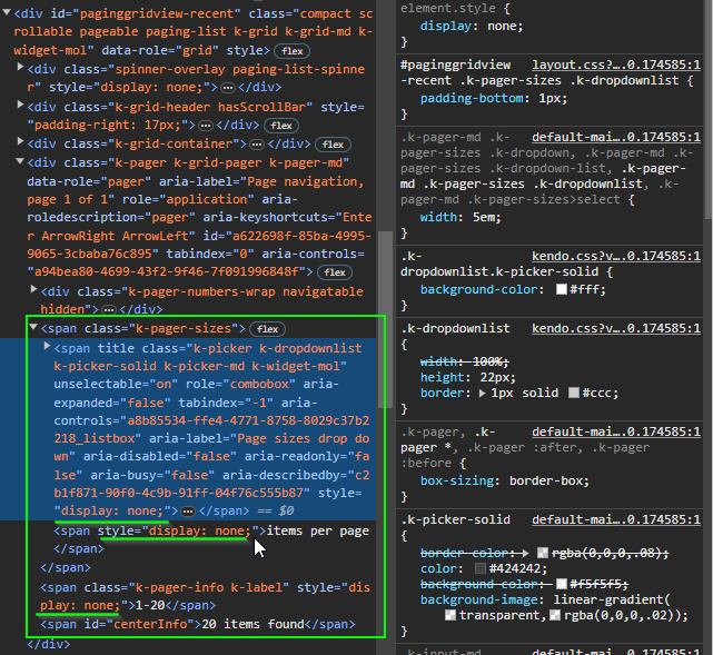 I'm using a k-grid with an items per page dropdown, it initially loads correctly but when a new value is selected then the pager elements are hidden.