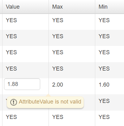 Value column has an inline validation of max and min. On entering the correct values also I am getting this error.