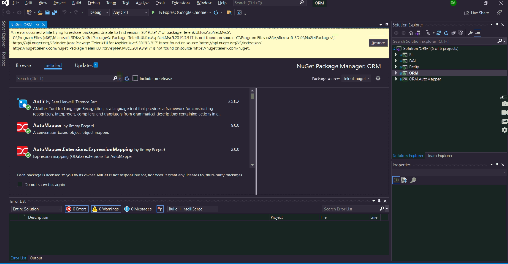 I mapped my project and it required to restore the kendo , but it appear this message !