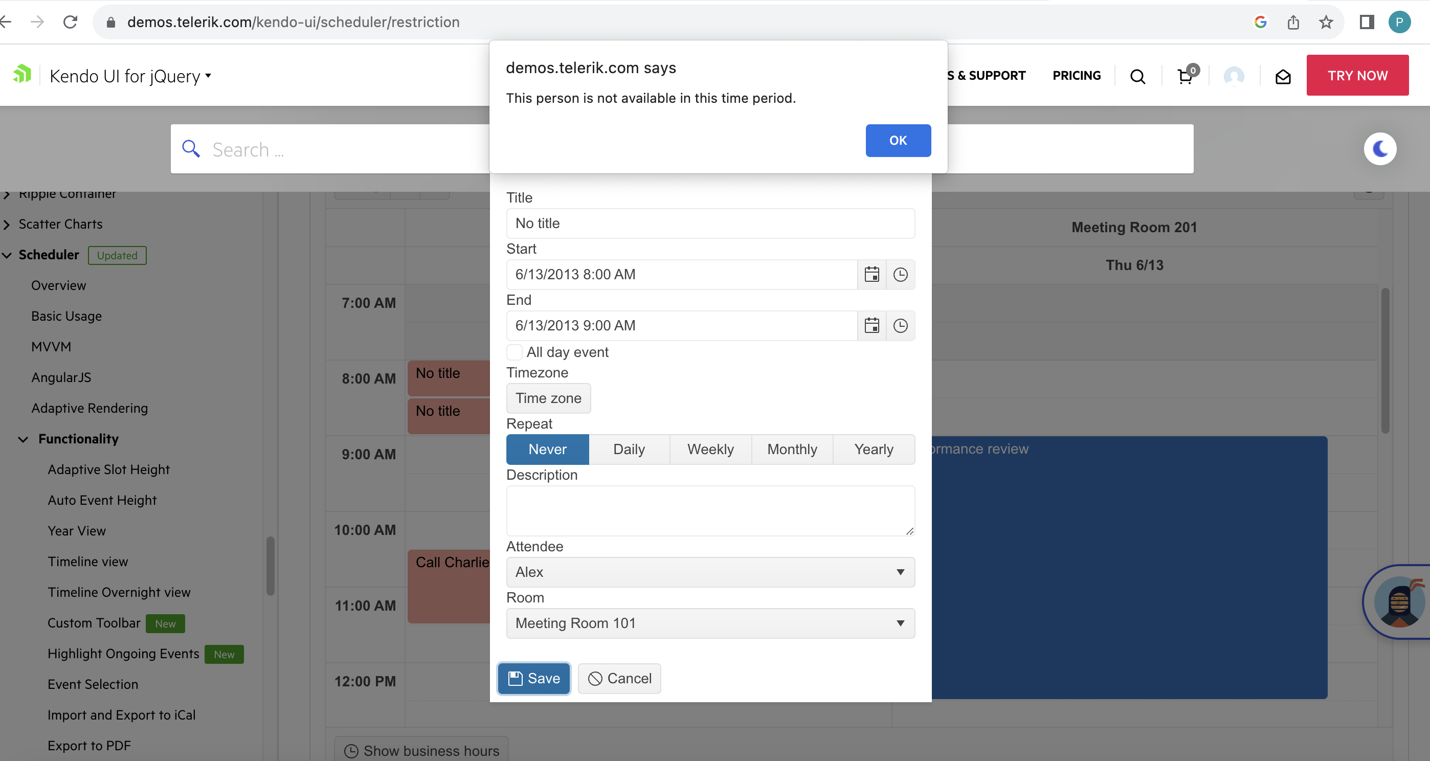 Hi I want to auto close the Popup box whenever any conflict is found in scheduler or when I press OK in warning box.  it could either be a edit popup box or create new event popup box. I want both will be auto close after warning message. PFA the same