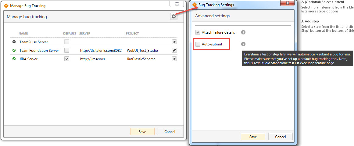 Where the bug gets automatically submitted depends on the default you have selected when you configured the bug tracker. See the attached screenshot for one am referring to. My development team confirmed that auto submit only works when running a test list. It does not work when running a single test.