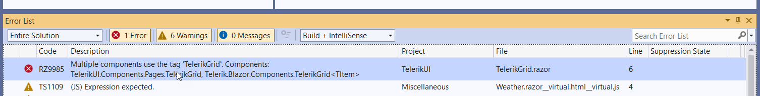 I am attempting to trial the Blazor UI. I am able to get the Telerik Button to work but not the Grid. See Error below. I have included the Repo on GitHub.