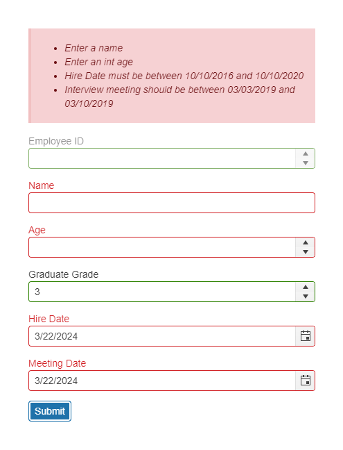 Clicking Submit to show that those fields are not valid.