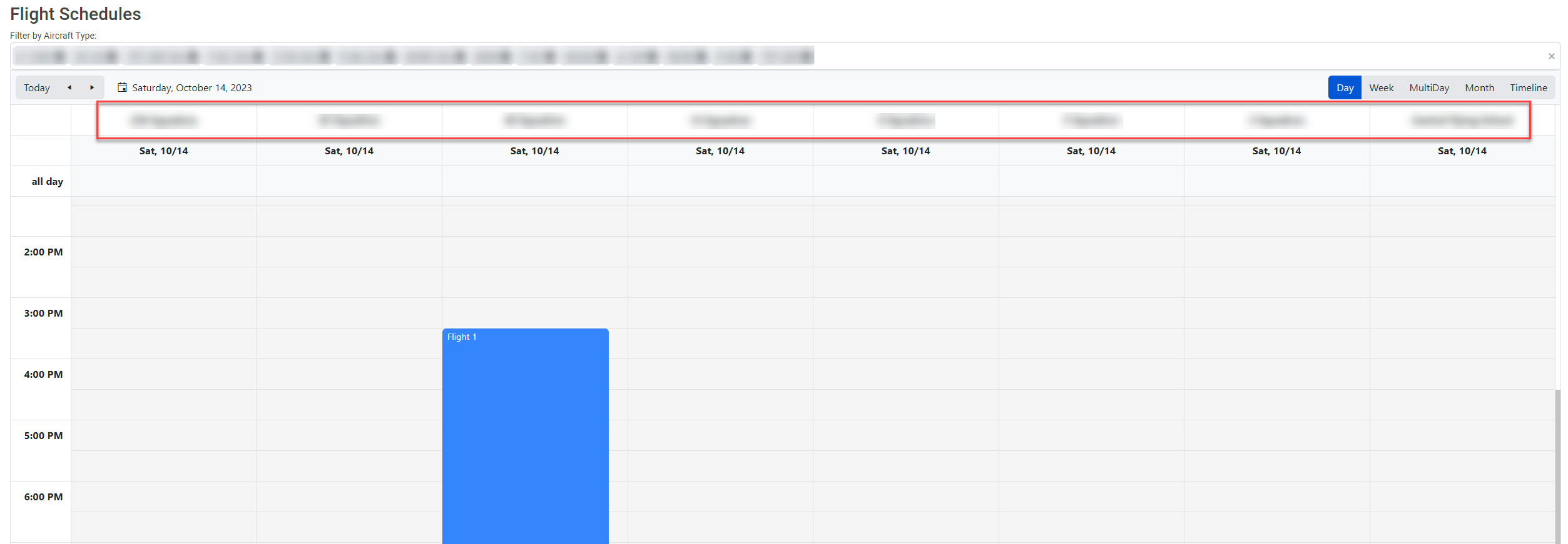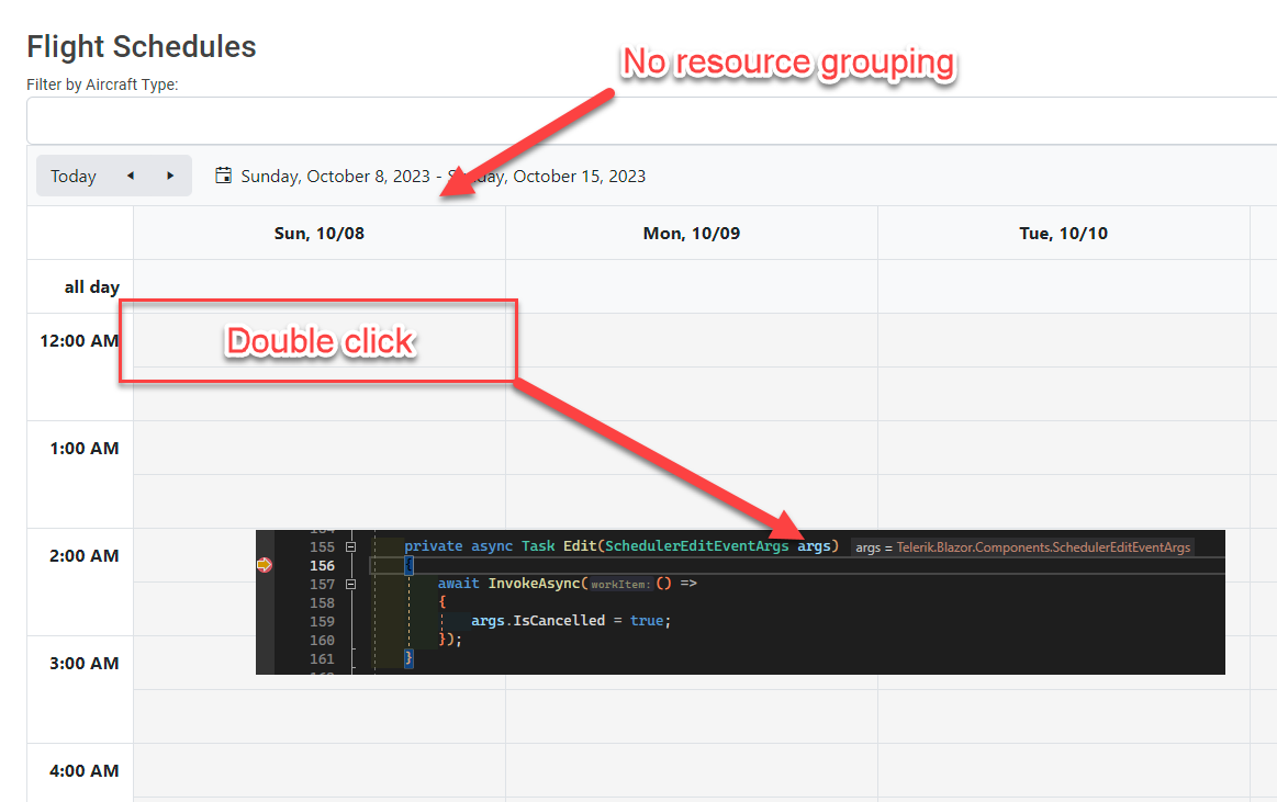 </TelerikScheduler>As you can see, we have grouping defined on one of the resources. This seems to work in the UI (aircraft and groups redacted for client confidentiality):