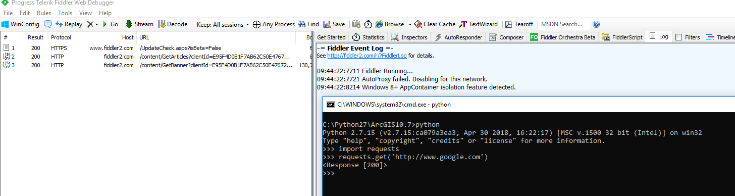 If I use Chrome to browse the web, I see plenty of sessions in Fiddler. The call to the requests library in python to get www.google.com however does not show up in Fiddler. Python is running in a cmd window.