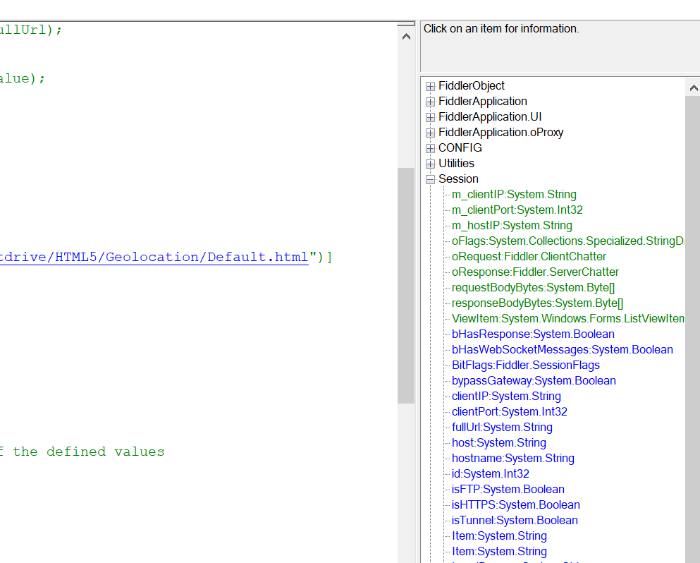 For additional object related information, the FiddlerScript Editor also includes an Object Browser as shown in the below screenshot.