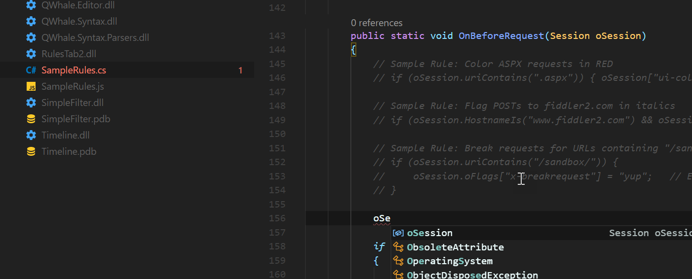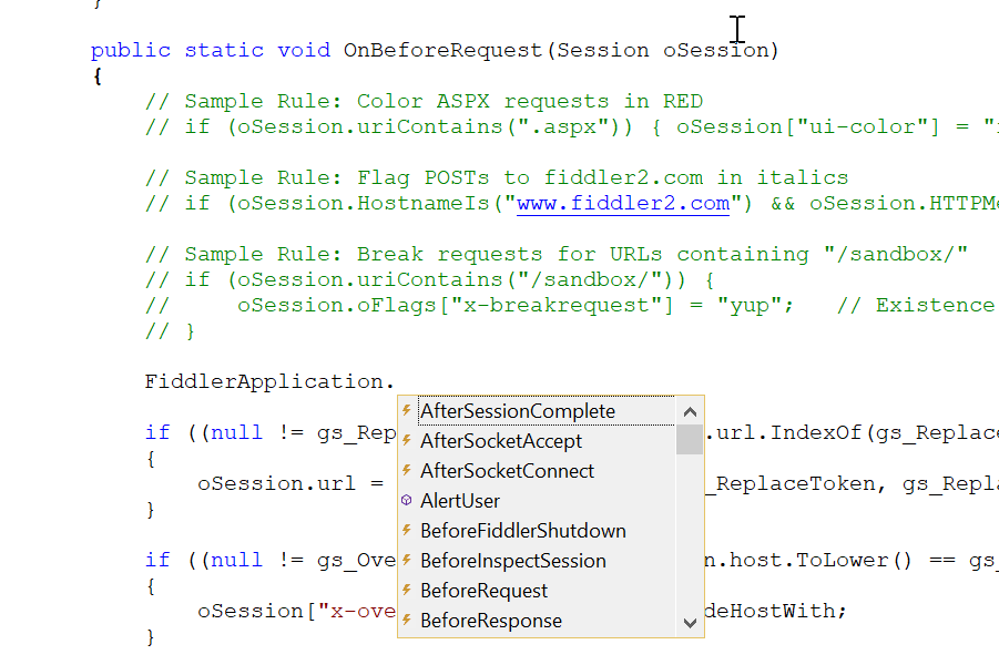 IntelliSense should be enabled by default for the included using statements at the top of the CustomRules.cs file. For example, if you open the CustomRules.cs file from the Fiddler Installation folder in Visual Studio Code, it should be similar to the screenshot below. Note the CustomRules.cs file is located in the scripts folder: %localappdata%\Programs\Fiddler\Scripts