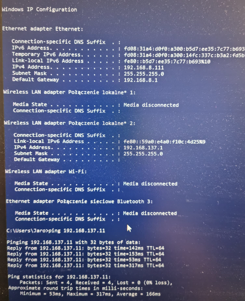 IP address of the wireless interface of the Windows device is 192.168.8.110