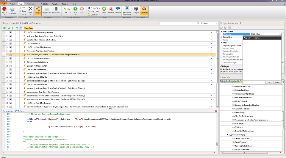 // Click on GeotechOrangeRadiobutton if(Data["Geotech (Orange)"].ToString()=="True") Applications.UIWPFexe.AddAlarmPopup.GeotechOrangeRadiobutton.Check(true); else { Log.WriteLine("Geotech (Orange) is False"); }}I got a previous discussion post on how to data drive the radio button and I have updated my test like wise. But when i added the details required for the already existing data driving file (.csv), those are not getting reflected in the test studio. I tried the 'Refresh ' button in test studio also, still it is not showing the added columns. Could you please let me know, what needs to be done to fix this. Do I need to create a new data file and bind it?Also how can I remove an already bound file from a test step?