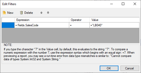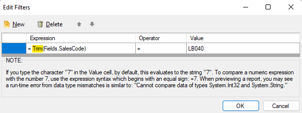 I absolutely know that SalesCode "LB040" exists, but my report is blank when I run it. If I delete the filter, the report shows all the SalesCodes.