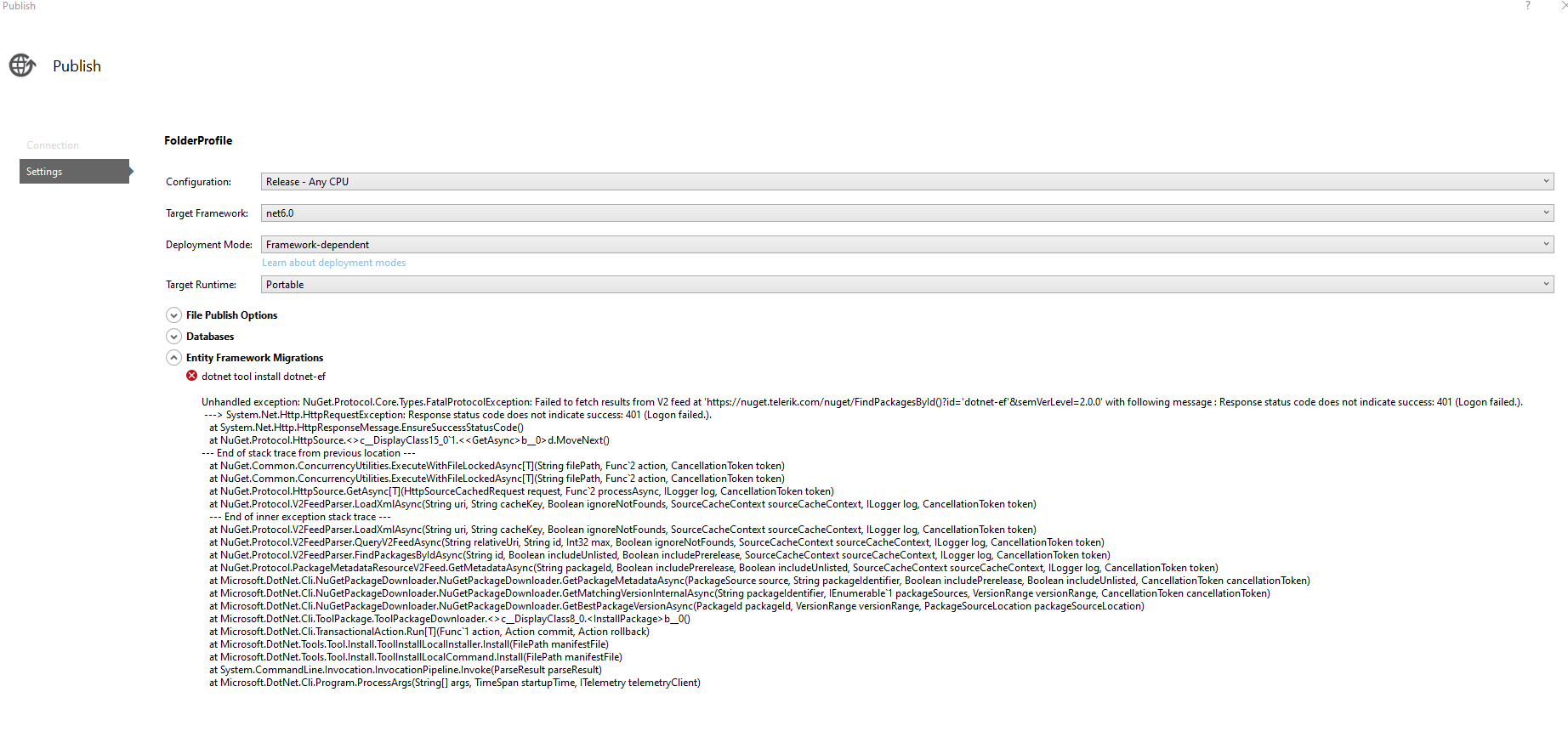 Last week our devops publish failed because of dotnet tools download failure. We had detailed look on the fail and found out that telerik nuget feed causing the error. We literally changed nothing about versions in the code but still we get the error nonetheless. Even the latest successfull published commit is giving the same error. Publish from VS is also giving the same error and Nuget solution with telerik package source in VS still works fine with our telerik credentials.