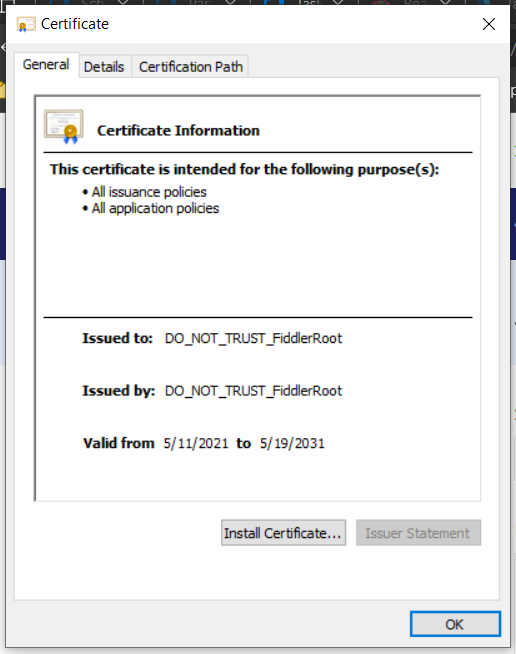 We are using Fiddler Classic with the CertMaker for iOS and Android extension. We made sure to "Reset All Certificates" through Fiddler and double checked if there were any leftover in the certificate stores (user and machine).