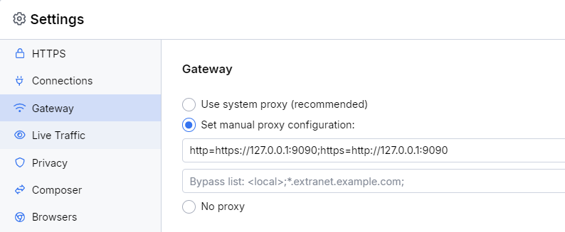 So I connect Fiddler to mitmproxy by setting the gateway proxy to mitmproxy listening at localhost:9090.
