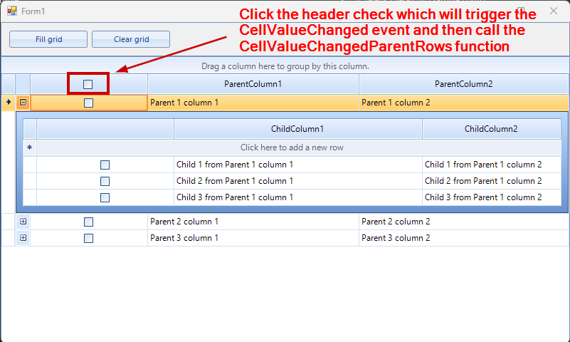 There are also some issues with the header check in the child rows. In this case, I do not have the EnableHeaderCheckBox = true in the GridViewTemplate but the problem is similar. Checking all the child rows of a certain parent row through the header check, updates the value on the "Chk" column but does not update it visually with the color.