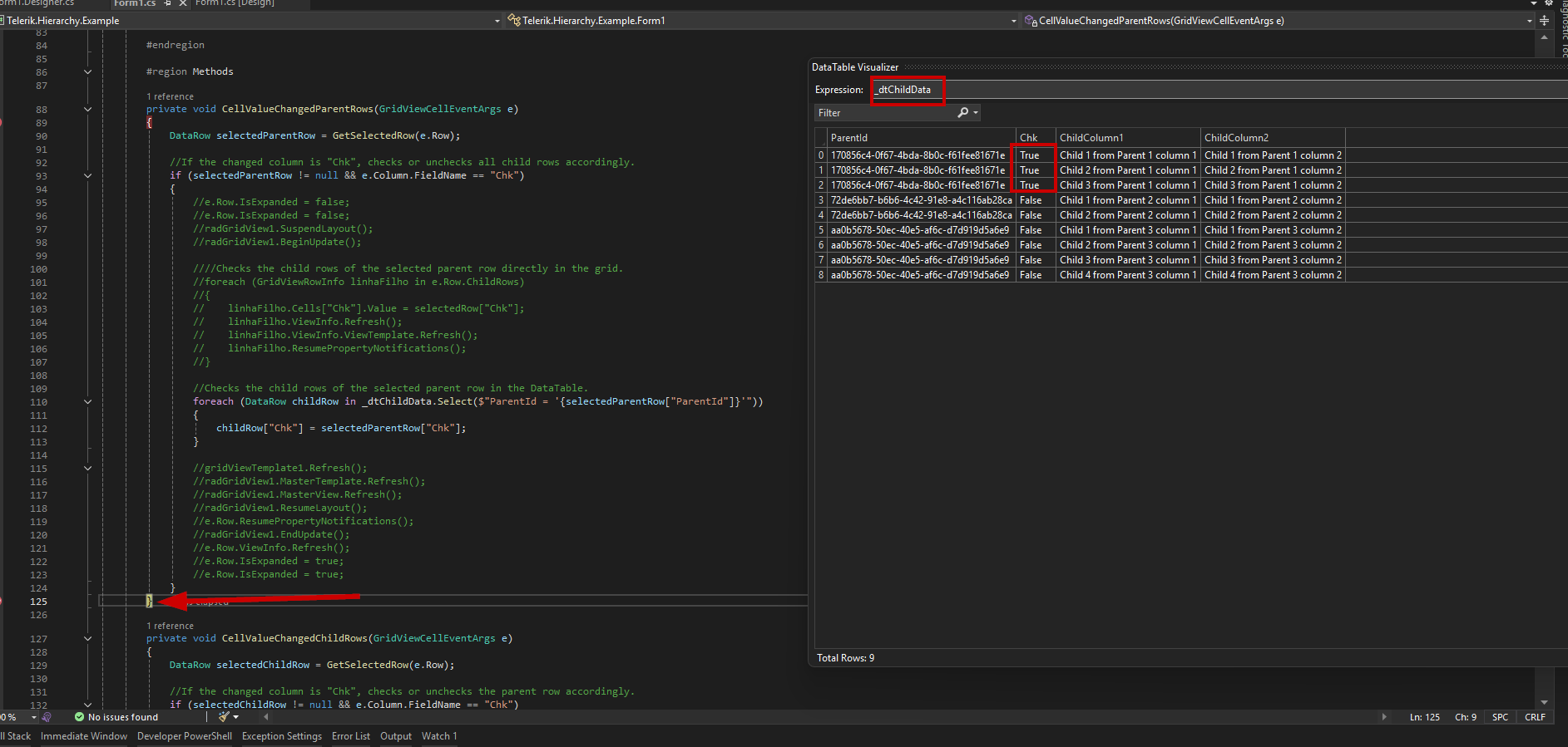 I am developing a form that has a radgrid with hierarchy and in some instances, the parent row makes changes to the child rows and vice versa.