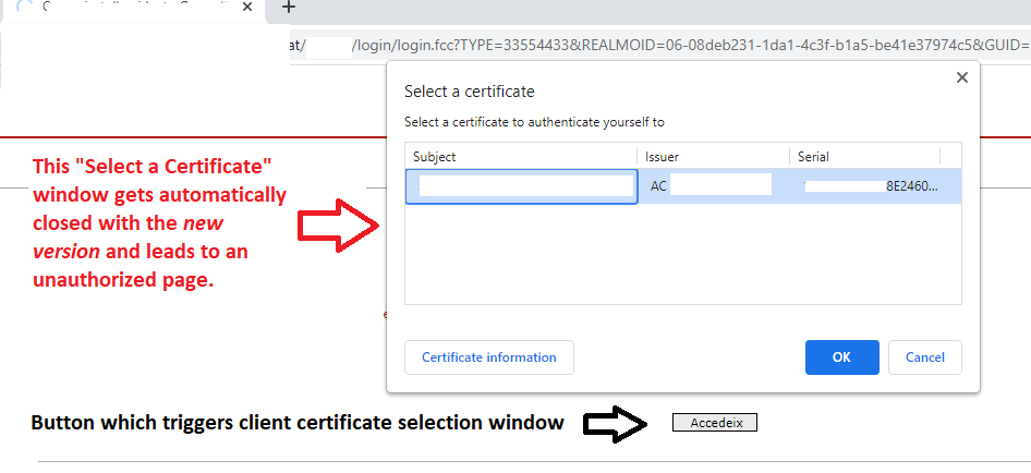- After clicking the button that triggers the Client Certificate Selection Window it gets automatically closed without the possibility to accept this certificate. Thus, we don't get authenticated.
