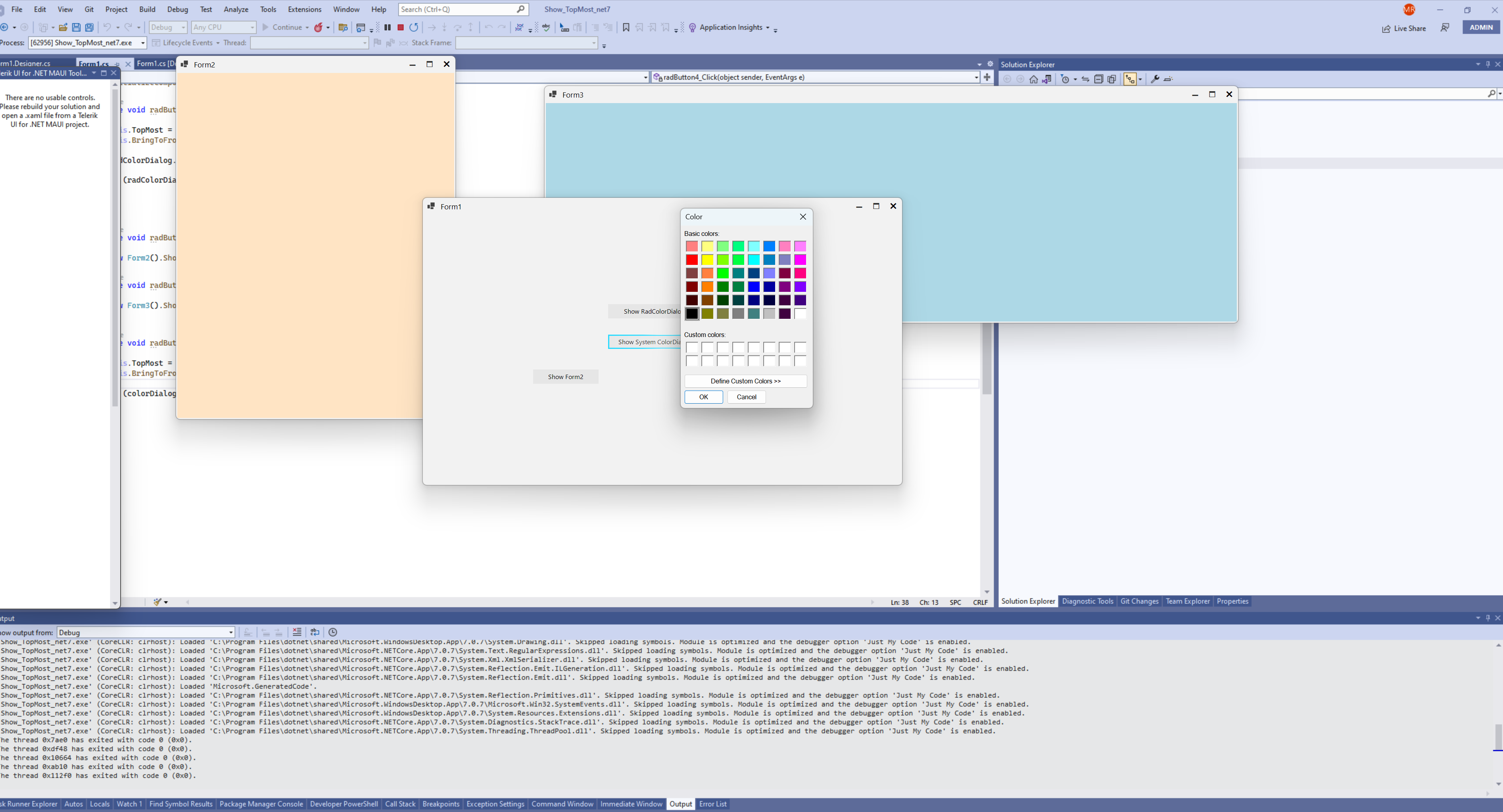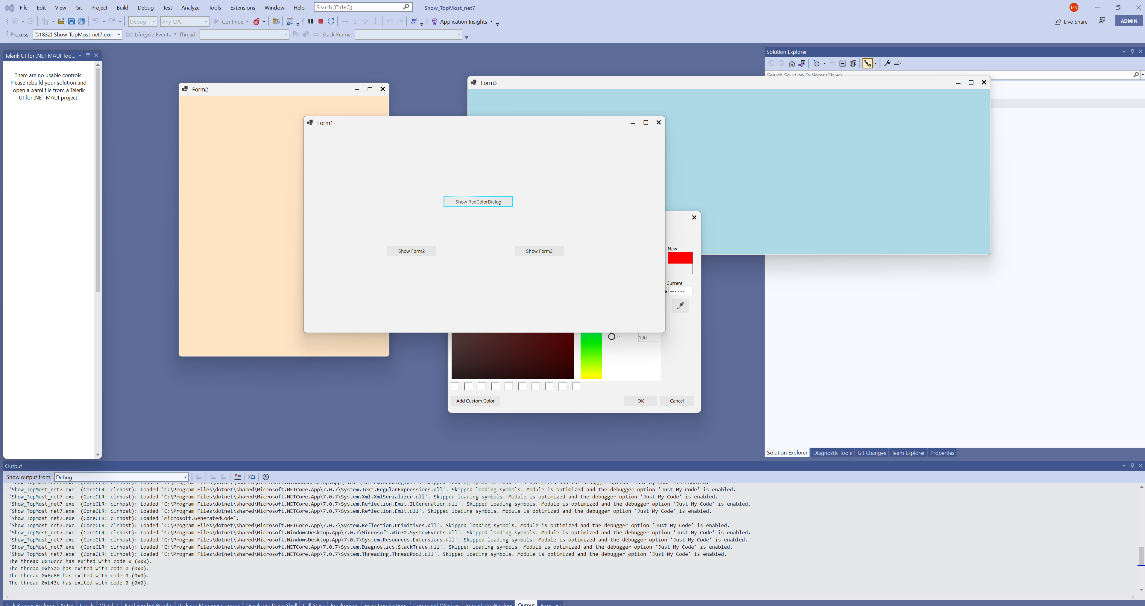 For the TopMost property: I have doubled check my project and you are right the RadColorDialog is placed under the form if the form is TopMost. It seems that I have overlooked it at first. It took me some time to investigate why this is happening. It turns on it is not directly related to our controls. You mentioned that you are using .Net7. I have tested it with .NetFramework 4.8 and this behavior is not observed. Our RadColorDialogs derives from MS CommonDialog which seems to be the problem. I have created a simple class that derives from this one and the dialog is not on top.