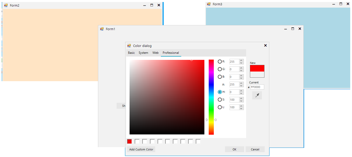 TopMost = falseThen bring the main form to the front, the Dialog is working and is on top.I am not sure why TopMost is not working on the RadColorPicker (and on my mahcine and not yours), it may be that the TopMost is overriding the Dialog form in this instance? maybe that should be set to TopMost, or have a setting on Dialog properties to set it?