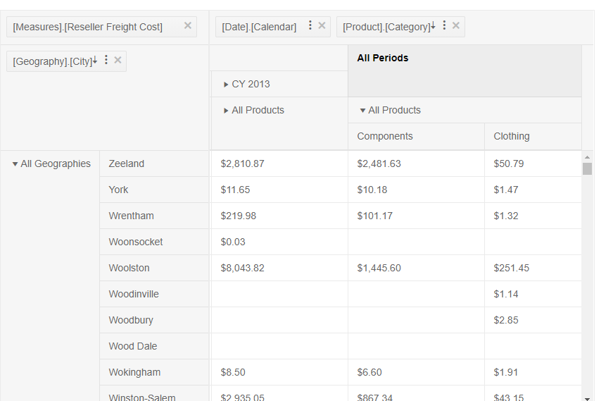 @(Html.Kendo().PivotGrid<MyProject.Web.ViewModels.Transaction>() .Name("pivotgrid") //.HtmlAttributes(new { @class = "hidden-on-narrow" }) .Filterable(true) .ColumnWidth(65) .Height(585) .DataSource(dataSource => dataSource .Ajax() .Transport(transport => transport.Read(read => read.Action("Transaction_Read", "Home").Data("SearchValues"))) .Schema(schema => schema .Cube(cube => cube .Dimensions(dimensions => { dimensions.Add(model => model.Product).Caption("Products"); dimensions.Add(model => model.Area).Caption("Areas"); dimensions.Add(model => model.Country).Caption("Countries"); dimensions.Add(model => model.State).Caption("States"); }) .Measures(measures => measures.Add("Quantity Sum").Field(model => model.Quantity).AggregateName("sum").Format("{0:n2}")) )) .Columns(columns => { columns.Add("Area").Expand(true); columns.Add("Product"); }) .Rows(rows => { rows.Add("Country").Expand(true); rows.Add("State"); }) .Measures(measures => measures.Values("Quantity Sum")) ) )Hi Grace,