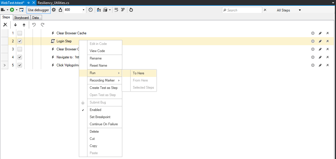 I found the "Step Builder" that allows me to add steps to a test, so this is nice (though I would have hoped that I simply can drag'n'drop them from my project panel !). But how to proceed from there ? E.g. after I added the login step, how to start the recording from that point ? Is this possible at all ?