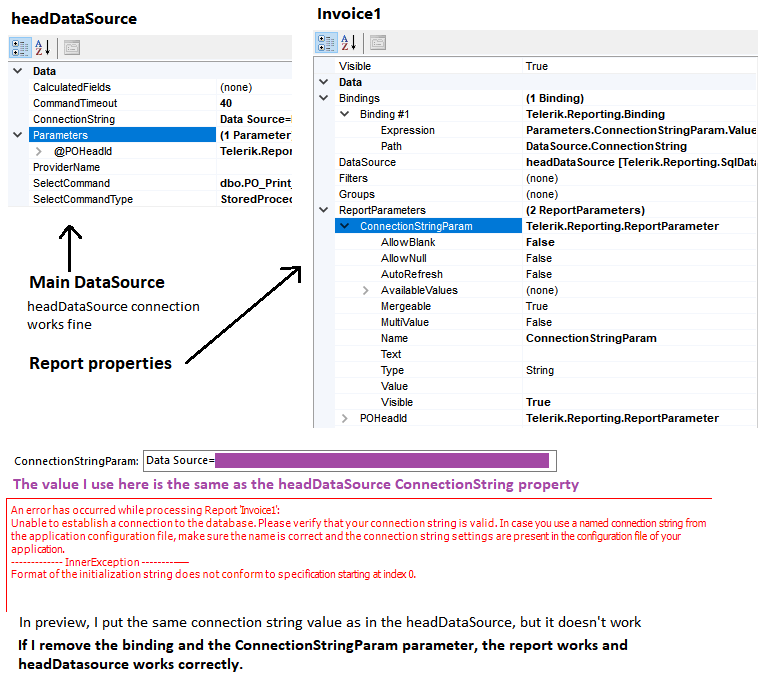 I've tried to use a parameter and a binding as stated here: https://docs.telerik.com/reporting/knowledge-base/how-to-pass-connectionstring-to-report-dynamically-through-report-parameter
