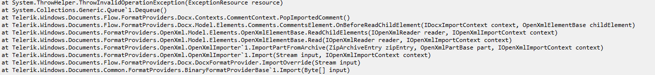 I am trying to accomplish a similar goal to the original poster's. I have a method which attempts to create a RadFlowDocument from a .docx file stream, and then to export this RadFlowDocument to PDF. It works fine for most .docx files. However, it is breaking on files that have "Track Changes" sections, throwing an InvalidOperationException. The stack trace is shown here: